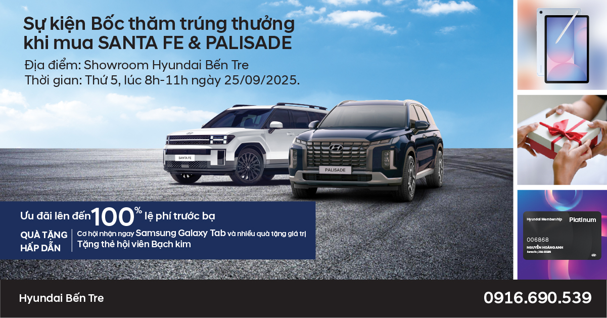 Dành cho khách hàng mua Santa Fe & Palisade ——————— Chương trình Bốc thăm chọn ra khách hàng may mắn từ sự kiện “Săn quà cực hay – Sắm ngay...